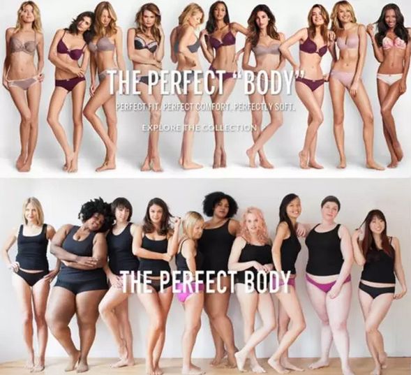 2014年,维多利亚的秘密曾拍过一张引发全世界震怒的海报。几个削肩细腰的模特并排站在一起,海报上印有“完美身材”的字样。