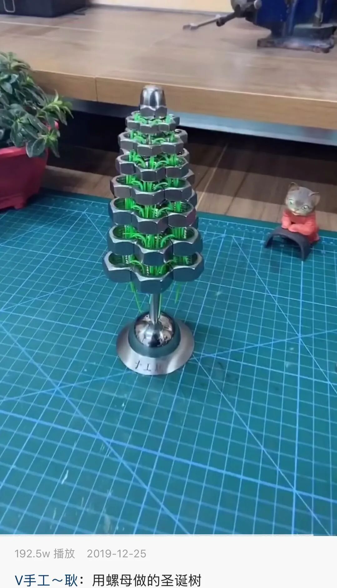 八八在快手上有位一直关注的老铁,是做手工的耿哥。他做的东西都奇奇怪怪,比如为了迎合圣诞气氛,用螺母做了一株圣诞树,真·金属感。