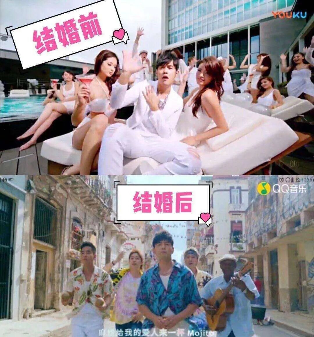 当然,哥哥也是有一点变化的。结婚前mv里都是香车美女,结婚后都变成了穿花衬衫的兄弟。