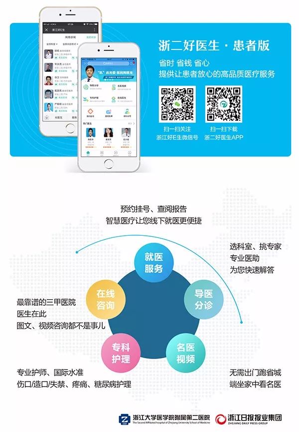 “浙二好医生”第一期上线了浙医二院1400多位主治以上医生,同时上线了导医分诊、名医视频、专科护理、在线医生四大板块功能。