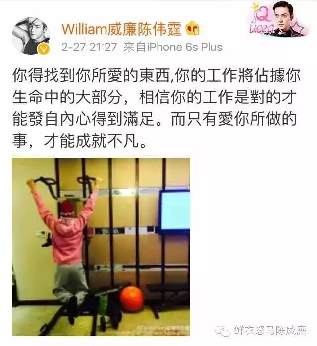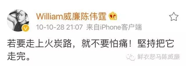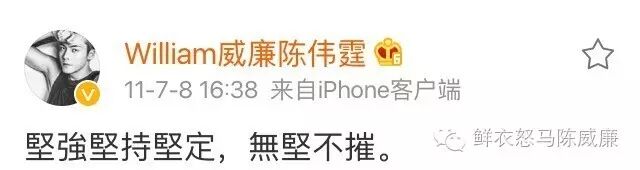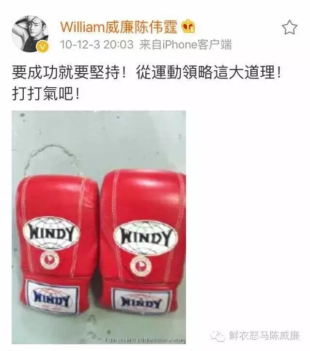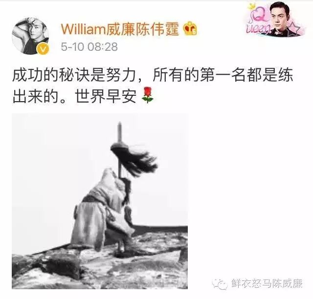 “成功的秘诀是努力,所有的第一名都是练出来的。世界早安[鲜花]”陈伟霆认为,拳不离手曲不离口,不持之以恒努力,是获得不了成功的,这个理论也贯彻他早期微博。