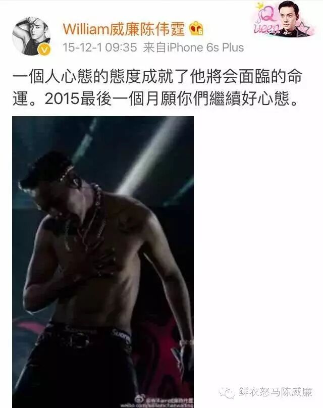 “一個人心態的態度成就了他將会面臨的命運。2015最後一個月願你們繼續好心態。”陈伟霆暖心鼓励粉丝拥有好心态!