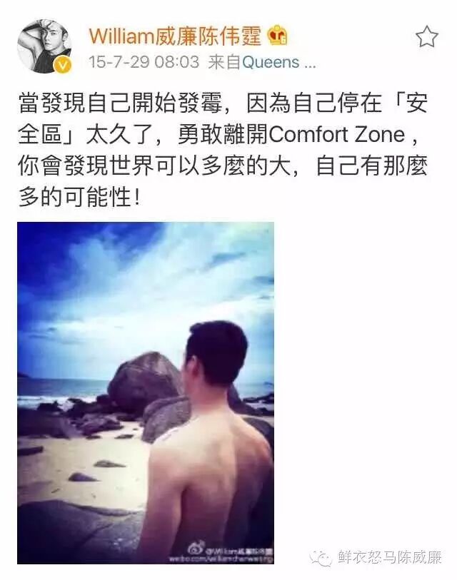“ 當發現自己開始發霉,因為自己停在「安全區」太久了,勇敢離開Comfort Zone ,你會發現世界可以多麼的大,自己有那麼多的可能性!”外出度假期间的陈伟霆表示自己要突破安全区,寻找更大可能性。