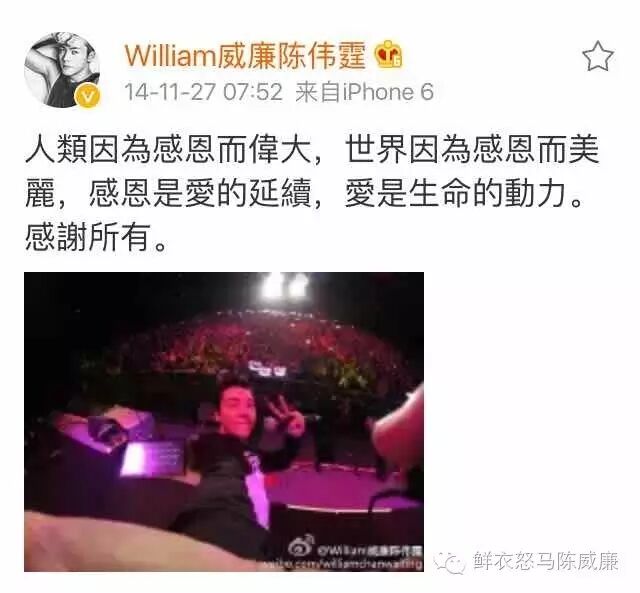 “人類因為感恩而偉大,世界因為感恩而美麗,感恩是愛的延續,愛是生命的動力。 感謝所有。”感恩节陈伟霆发表暖心感悟,感谢生命和爱。
