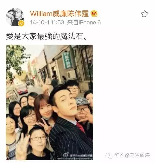 作为鸡汤达人,陈伟霆在粉丝中流传最广的一句名言毫无疑问是这句爱是大家最强的魔法石。