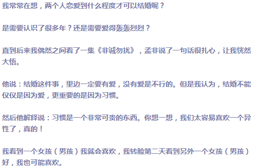 可贵的是什么,当我跟她(他)相处,我们有感情了之后,她(他)跟我在一起成了一种习惯了,我已经离不开这种习惯的时候,那个时候进入婚姻,是相对比较安全的。
