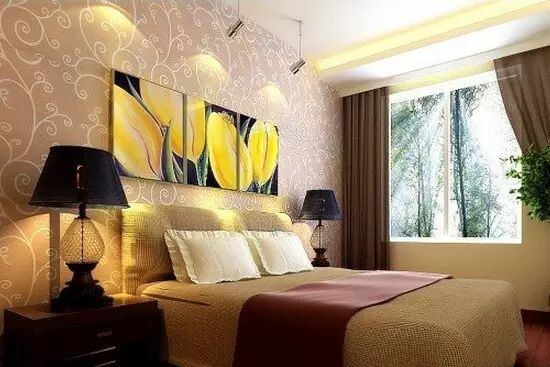 卧室有着淡淡的优雅气息,整个房间给人带来心灵的宁静感,黄色的长方形挂画,为空间增添了亮丽的色彩,窗帘一角的造型别致的绿色植物,增添了空间的生机感。床头两侧的黑色台灯,有着对称的美感。