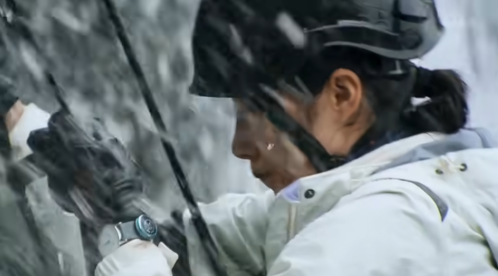 其中一幕,是她和张丹峰被分到一组,两人需要在水流很强的瀑布里挑战攀岩。