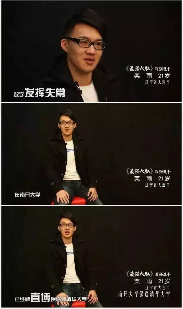 高二随缘一考,被签约到了清华。觉得自己不比其他同学聪明,结果申了六项专利,说当时只是觉得好玩。平常最爱健身游戏烫头的小哥,没去说相声反而跑来参加《最强大脑》。