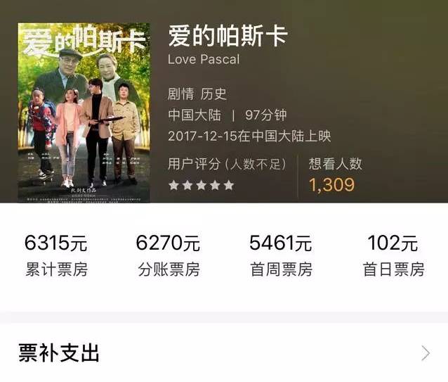 杜海涛主演电影《爱的帕斯卡》上映一周,截止目前,票房终于突破6000元大关。