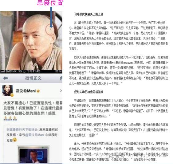 香港著名影星谢霆锋在拍摄电《十月围城》时,饰演一位剃了光头的角色。剃头之后,发现头上有一颗黑痣,但他没觉得奇怪。后来, 他再次剪短发的时候,发现黑痣变得很大!于是他去医院检查,医生告诉他,这不是一颗痣,而是一个黑色素瘤,是皮肤癌的一种。不过幸好他发现得早,可以用手术解决,后来谢霆锋做了手术,还缝了5针。