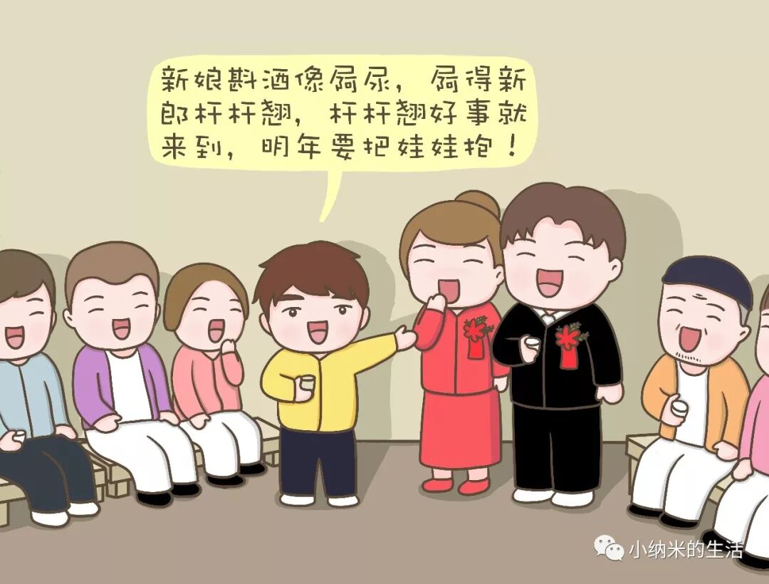 新娘斟酒像屙尿,屙得新郎杆杆翘;杆杆翘好事就来到,明年要把娃娃抱。