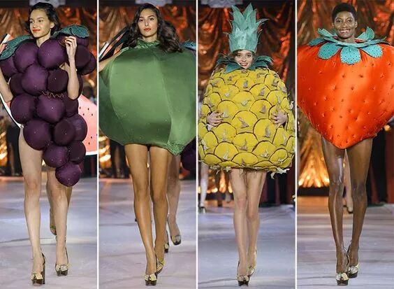 然而,事实证明单纯做衣服已经满足不了设计师的脑洞了。Charlotte Olympia已经将此发挥到了极致,夸张到把整个水果穿在身上。