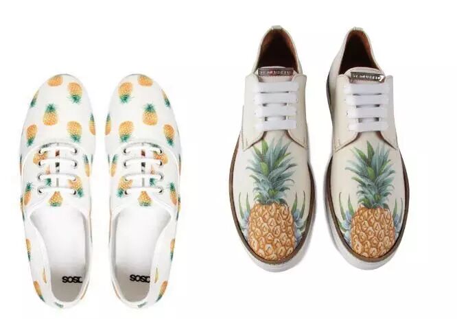 还有很多品牌的鞋子的图案在设计里也加入了充满年轻和趣味,香蕉、橙子、樱桃等不同图案,火速超越了小白鞋的地位成为博主们的新宠,其中菠萝的图案更是点单冠军。