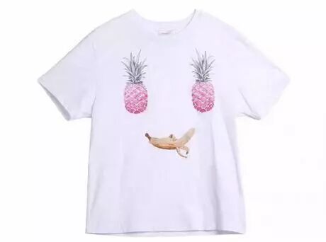 T恤一定是最适合夏天且最百搭的单品之一,粉色的菠萝和黄色的香蕉构成一张笑脸成为T恤上的印花,搭配牛仔裤就很好看,给你和周围人带来一天的好心情。