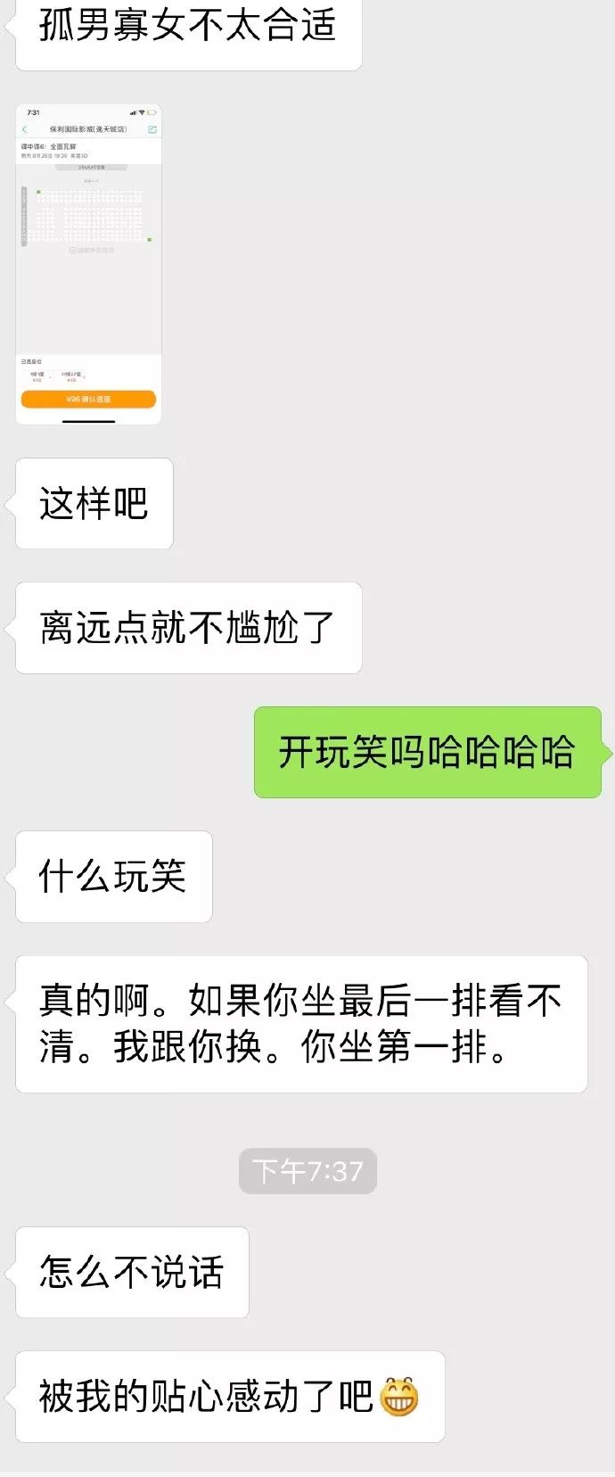 比如这位约相亲对象看电影的小哥,不仅担心电影院太空两人初次见面会尴尬,还觉得孤男寡女共处一室不太合适。