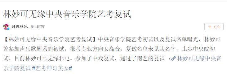 借着艺考的东风,林妙可无缘北京电影学院后,今天又落榜中央音乐学院的消息,再次引起网民的围观。