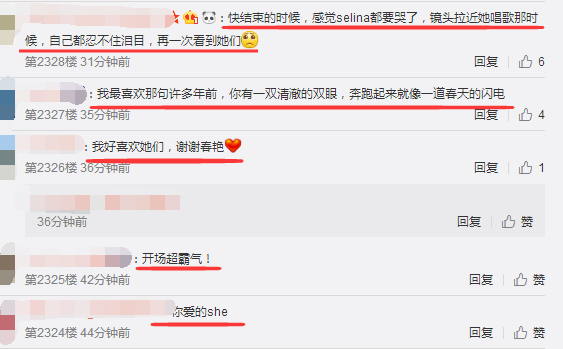 “快结束的时候,感觉Selina都要哭了,镜头拉近她唱歌那时候,自己都忍不住泪目,再一次看到她们”