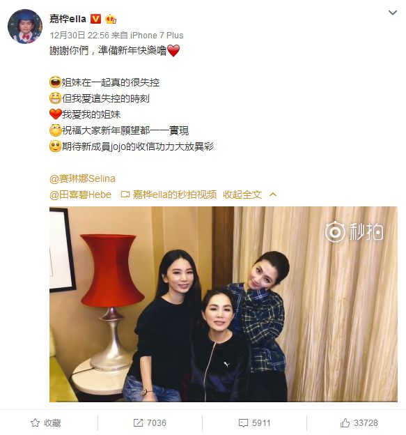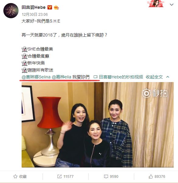 之后,作为好姐妹的Hebe也发文表示:“SHE合体最美,合体最疯癫,新年快乐,谢谢所有歌迷。”并且艾特了两位好姐妹Selina和Ella。