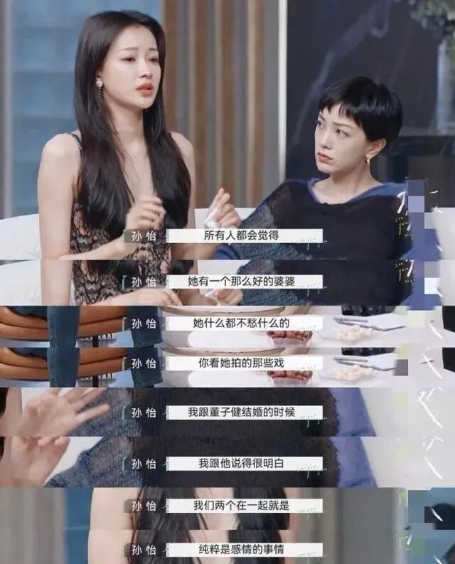 在访谈节目中,孙怡回应自己嫁给董子健并不是为了资源钱财,自己的戏约都是自己的经纪人去谈来的,和董子健在一起只是为了感情,并不为其它。