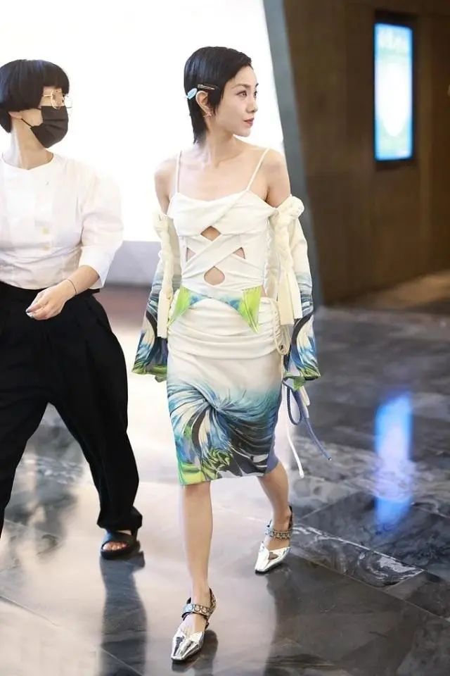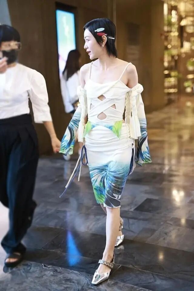 郭采洁穿的这条绑带镂空吊带,在颜色上面的选择就是大面积的白色调,这样看着雅致迷人,而且也把她的好气色给展现了出来,看着很动人。