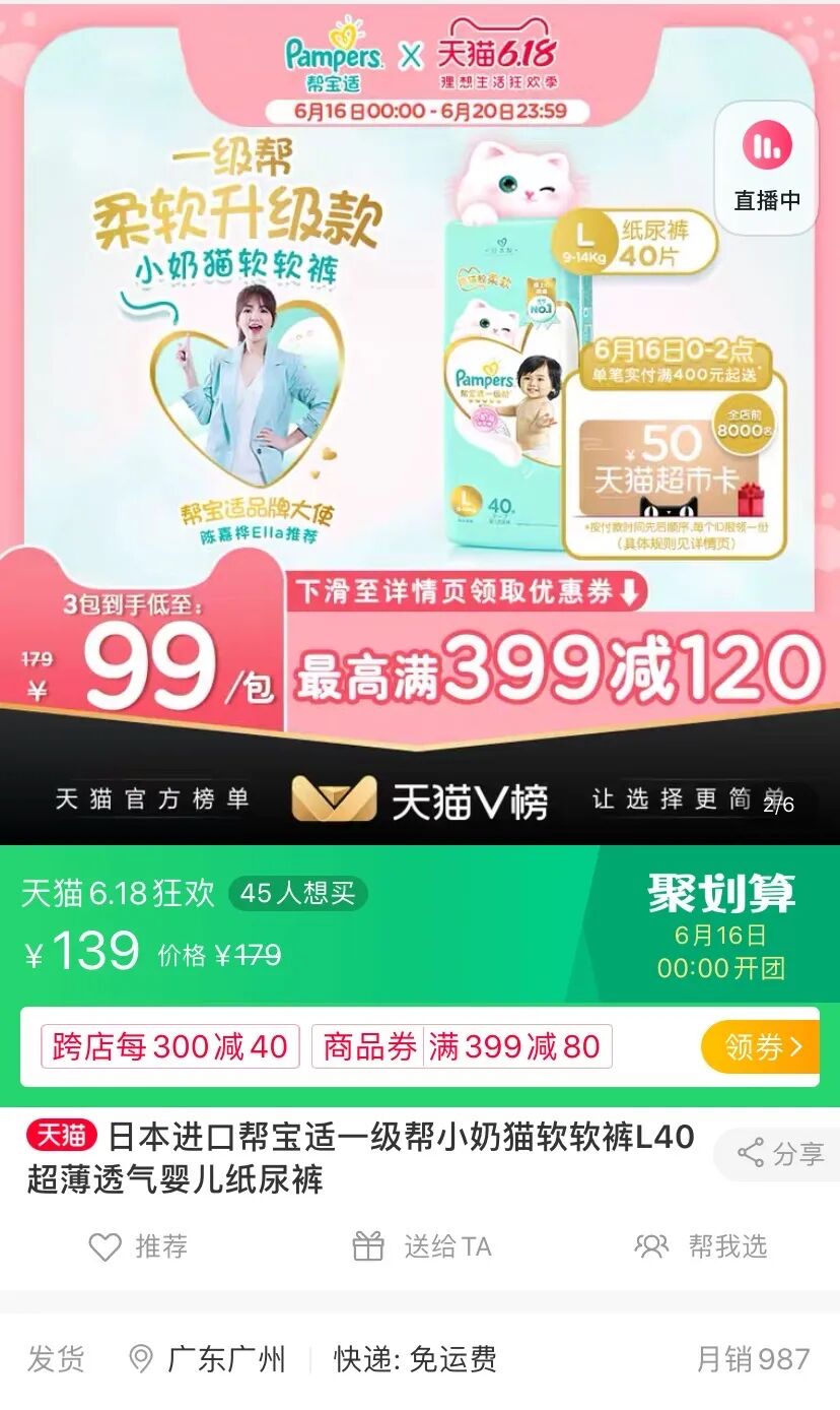 也是因为帮宝适一级帮出色的舒适性,现在我们家这个娇宝贝只认它,其他牌子压根就不乐意穿。所以如果你家也供着一个皮肤娇嫩的宝宝,一定要试试!上淘宝搜“帮宝适一级帮”就能买到,记住一定要先领券然后点一下开团提醒!这样16日买下来满399就能减120,原价179一包到时只要99元!整整55折啊!几乎等于买一送一了!
