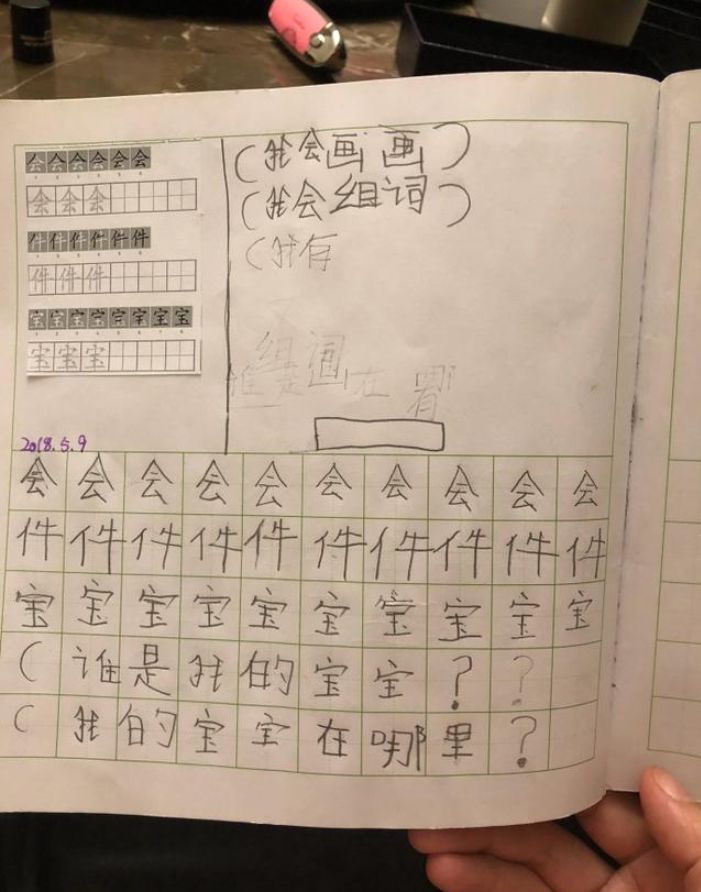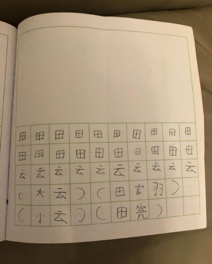 直接写出两个套路一样的句子:“谁是我的宝宝?”、“我的宝宝在哪里?”,后面在“云”的造句中,居然还提到了自己的爸爸田亮,大云是自己田宸羽,小云是爸爸田亮,而且还把爸爸的名字写错了,哈哈哈,这不是想要当自己爸爸的老大吗,不知道田亮看完自己儿子的作业之后有什么想法,