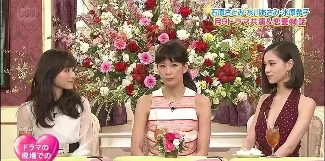 首先是这张坐着的图,忽略中间那个人,两边的高下,实在是有点明显。右边的水原希子,脖子的线条简直好看的不行,肩平却不柴,而石原里美...造型服饰气质全都差了很多。