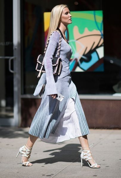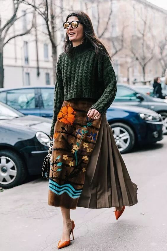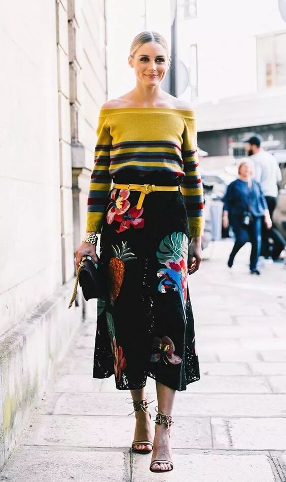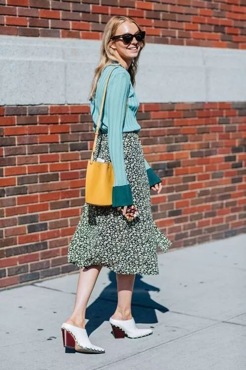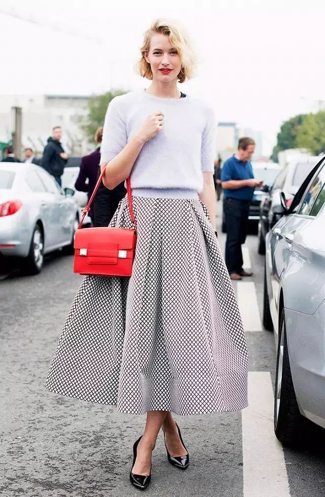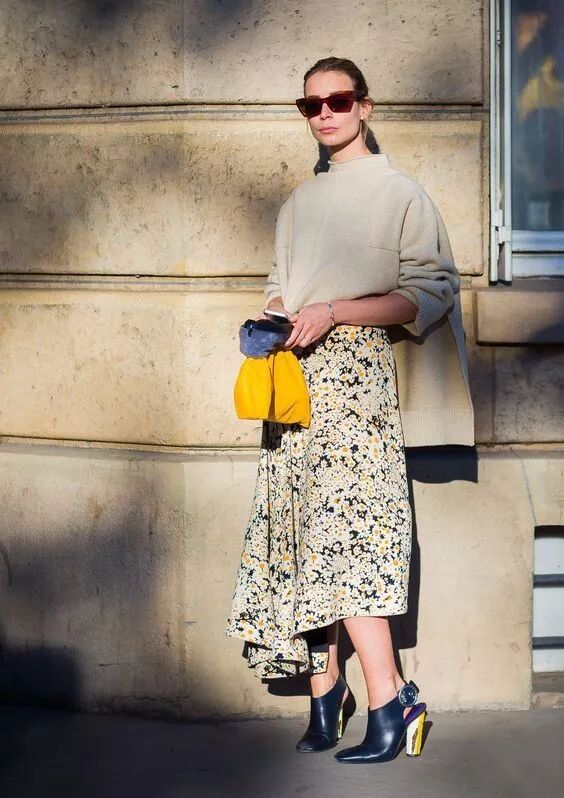 时尚编辑Giovanna Battaglia也不能错过毛衣+伞裙的魅力,印花伞裙独具异域风情,而纯色却又如少女般清丽可人。▼