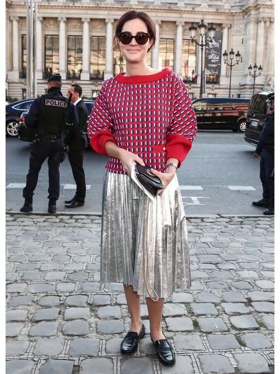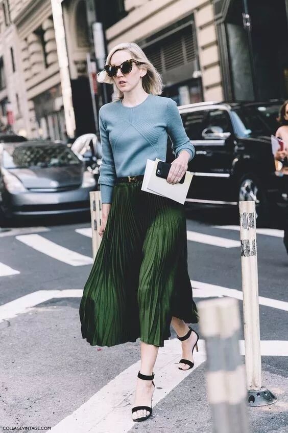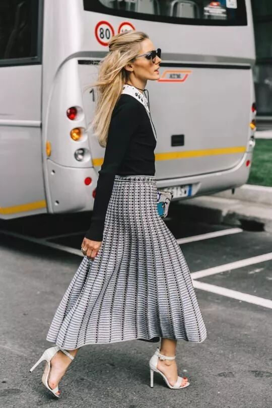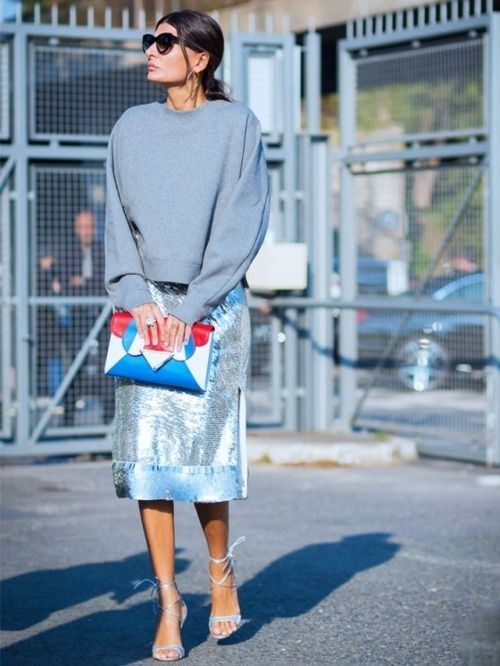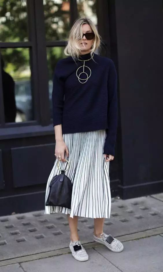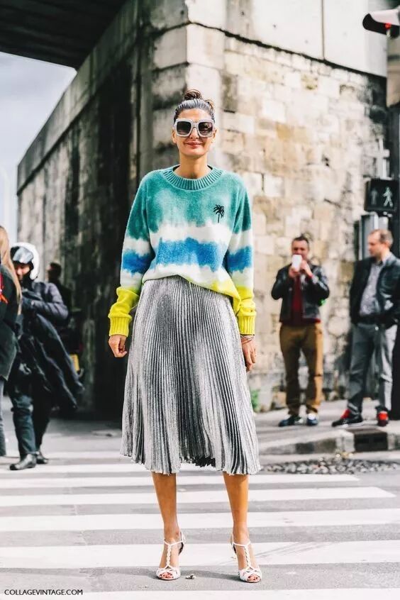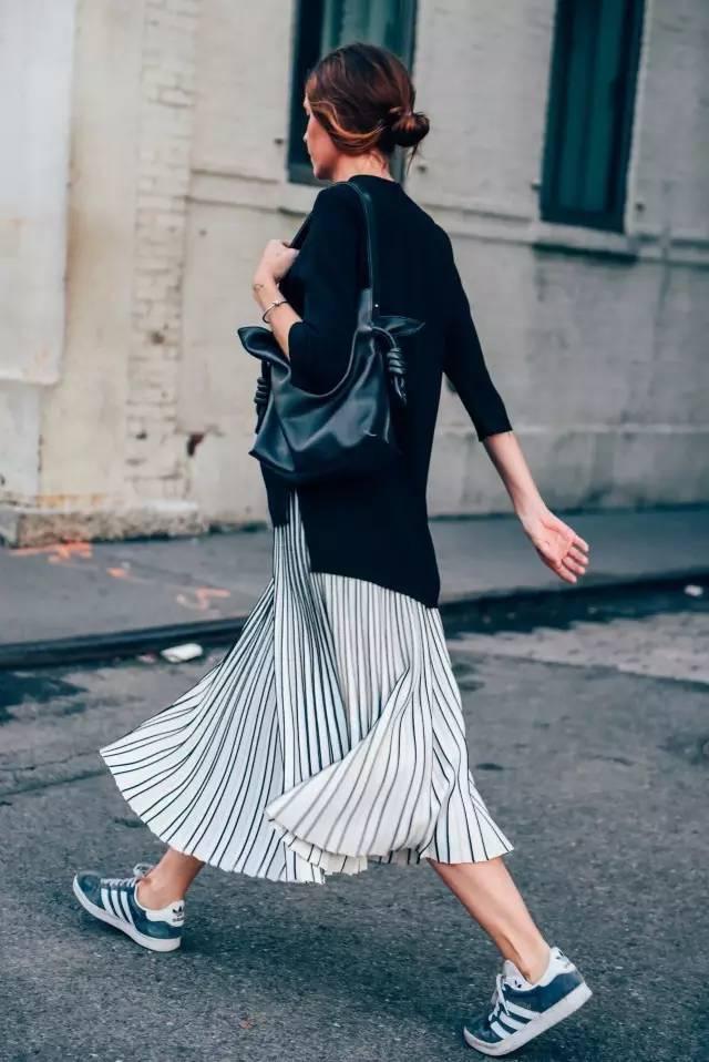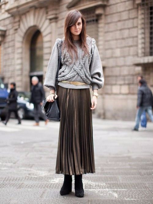 不过当下最火的当属这种金属色百褶裙。看似难以驾驭实则与褶皱设计却是绝配,既增加了百褶裙的时尚感,又保留了它本身所拥有的质感与文艺范,吸睛却不浮夸,养眼得恰到好处,随随便便搭一件大毛衣就足够时髦。▼