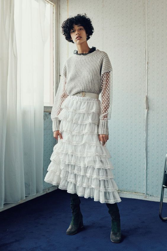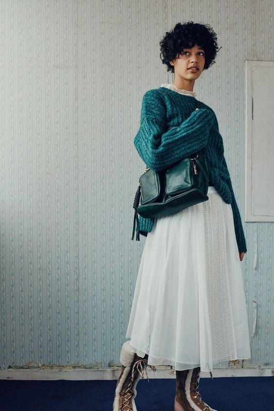 选择薄纱材质的百褶裙,与大毛衣最能穿出轻盈仙女感,很适合下半身粗壮的人。▼