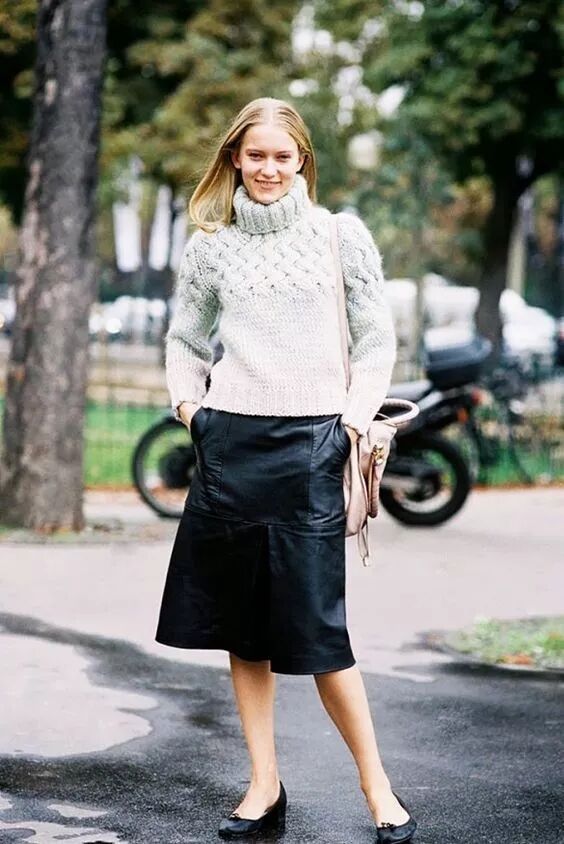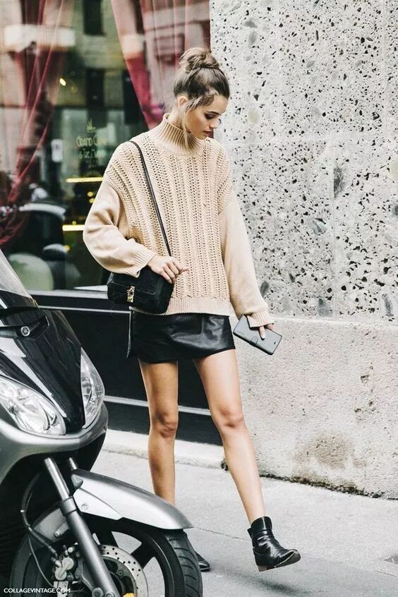 毛衣+皮裙的LOOK,搭配一双小短靴最时髦。▼