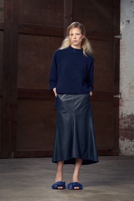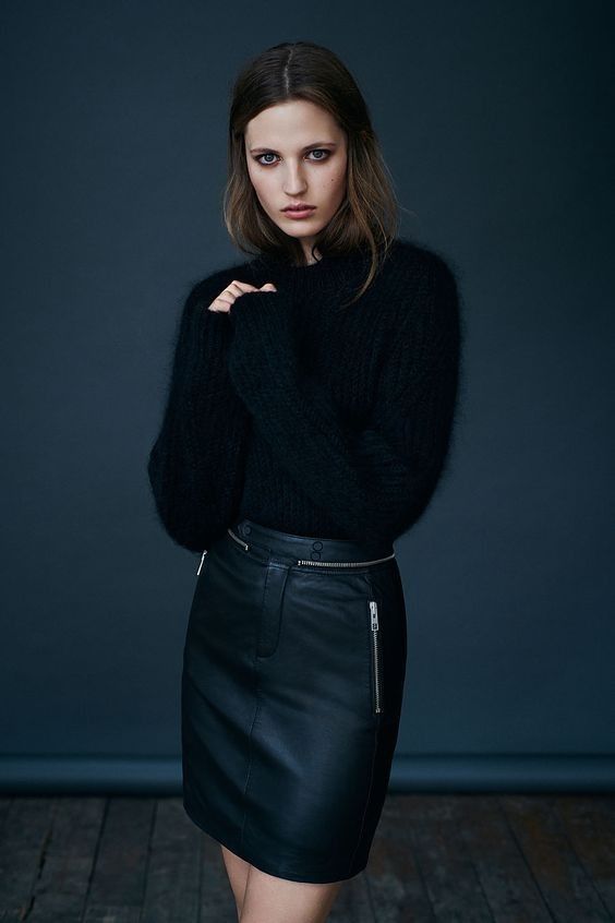 皮裙质地挺括且带有光泽感,所以搭配同色系的毛衣就可以冷艳潇洒超霸气,Icon们都抢着穿。▼