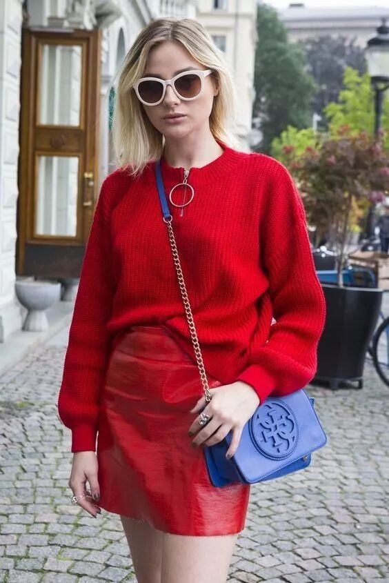 尝试一些彩色皮裙点亮你整个秋天,同色系搭配最好驾驭了。▼