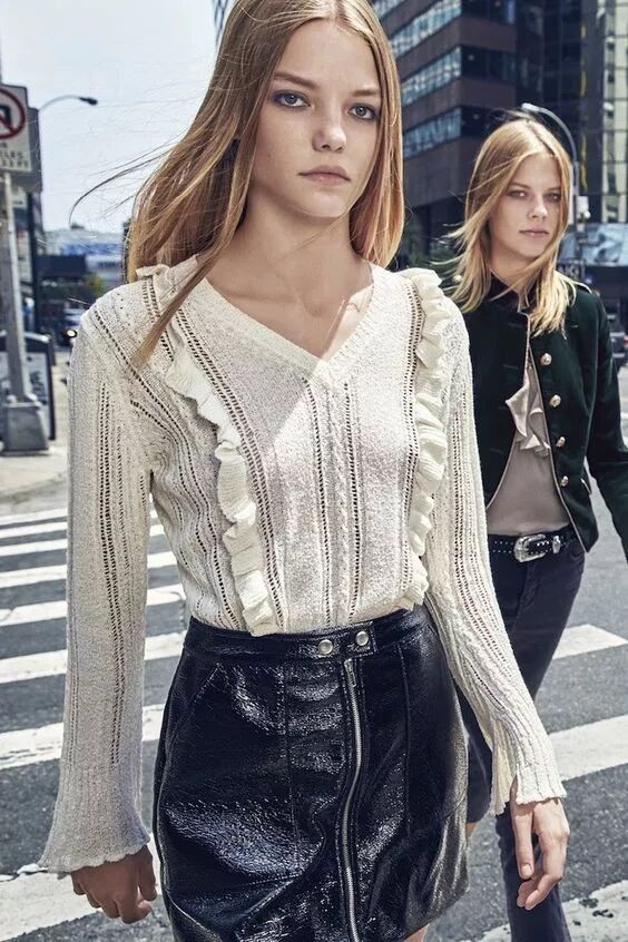 皮裙是硬朗风的单品,和软糯的毛衣组CP,完美演绎娘Man风。▼