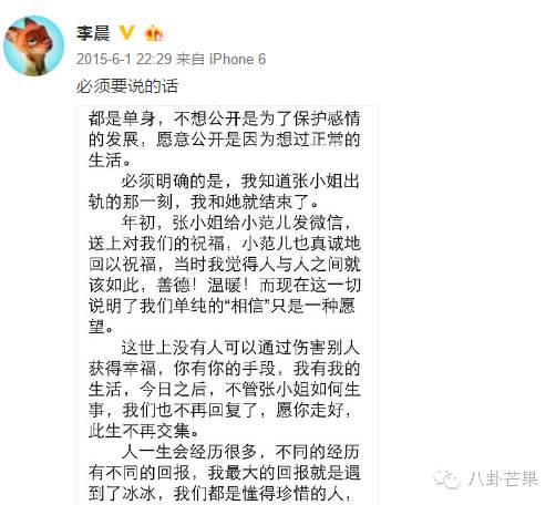 李晨顶不顺了,发了长微博撇开和张馨予的关系,说在知道她出轨的一刻,他们的关系就结束了,和范冰冰在一起的时候,双方都单身,力保范爷清白。