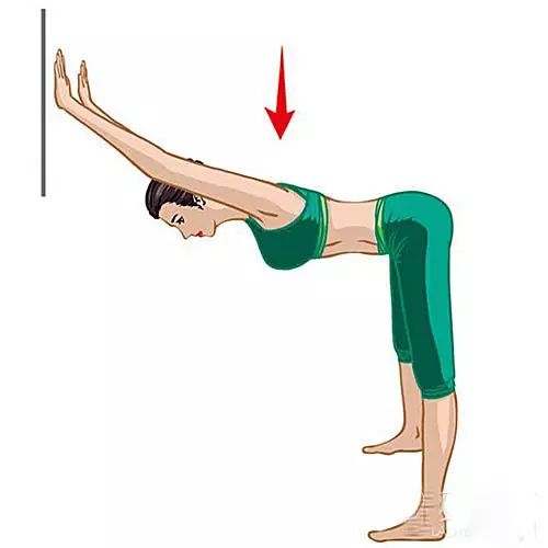 手臂伸直与面部同高,扶墙下压,感受腋窝下后侧的伸展。随着呼吸,做8~15次动态动作。