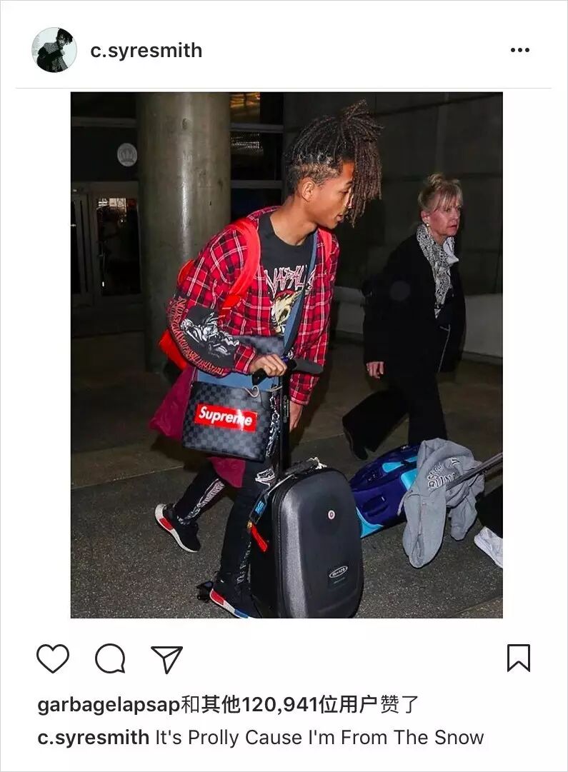 说“自制”可能有些夸张了,其实 Jaden Smith 只是在自己的普通 LV 挎包上贴了一张 Supreme 的 Box Logo 贴纸而已。要说如今的 Jaden Smith 在时尚领域也是有一定造诣的,甚至之前还拍摄过 LV 的宣传广告。而眼看着 Travis Scott、A$AP Rocky 等人已经提前上身了这一话题性联名,这一举动是不是在给官方递话:“你们也该给我寄一些了”。