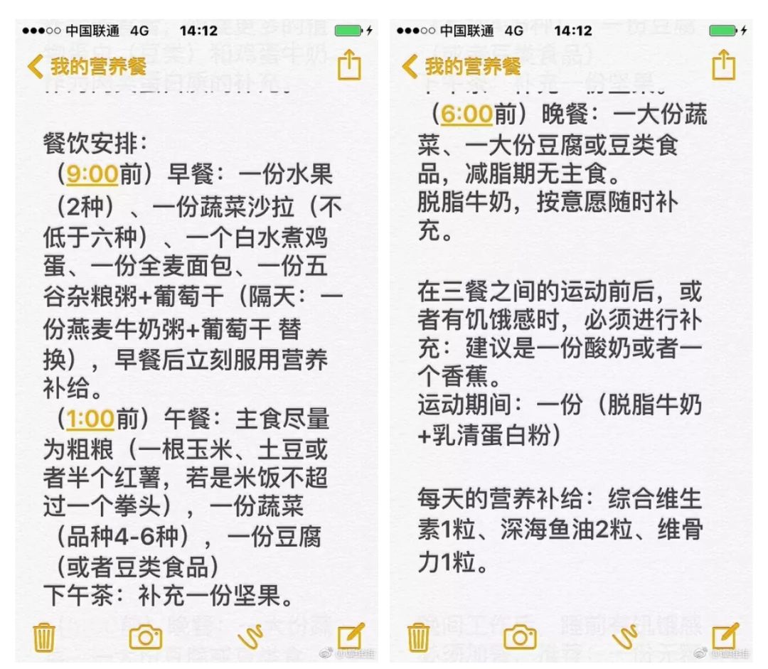 他的减肥方法是以少量多餐为主,再以跑步、举哑铃等运动做辅助。看看她的食谱,自律的人都不会太胖!!