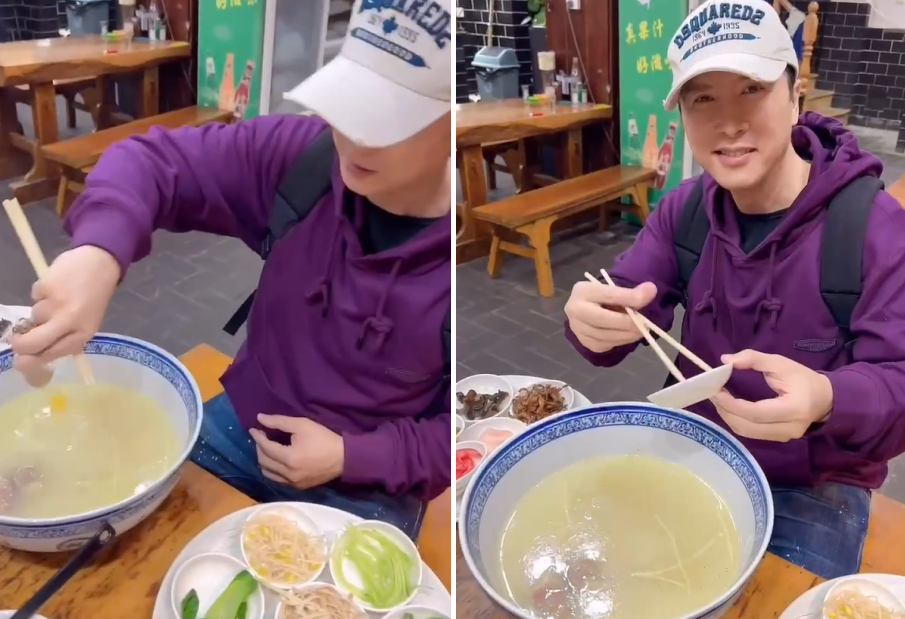 在甄子丹晒出的视频中,他带着大家“沉浸式”的体验了一回吃过桥米线的过程,一脸的兴奋的模样,看起来真实又可爱。