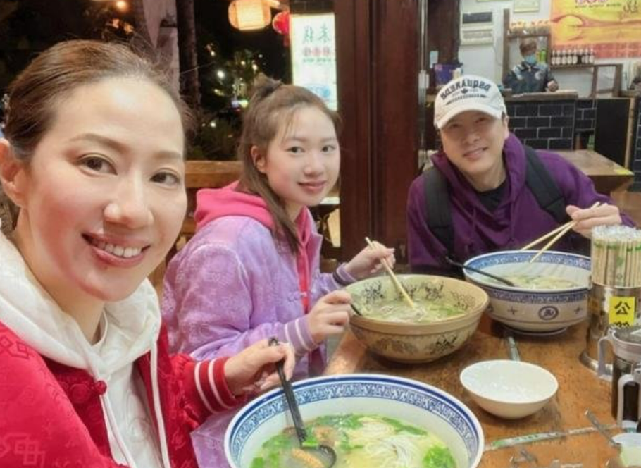 一家三口每人面前都摆着一个超大的面碗,看起来甚至比头还要大一圈,全家坐在饭桌前的合照,大家的脸上都洋溢着满满的幸福感。