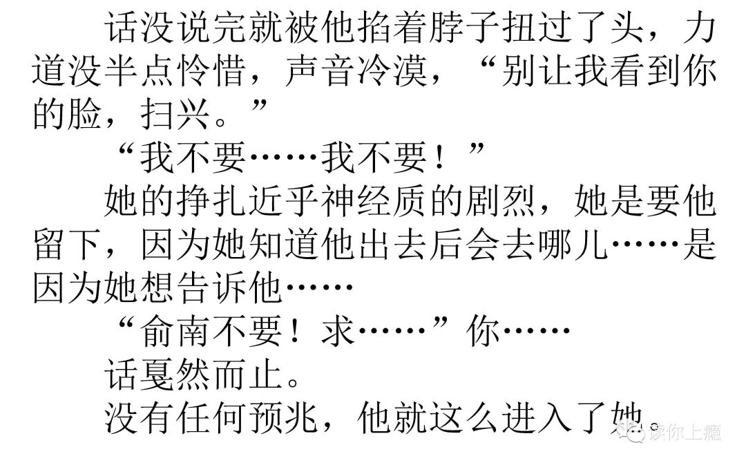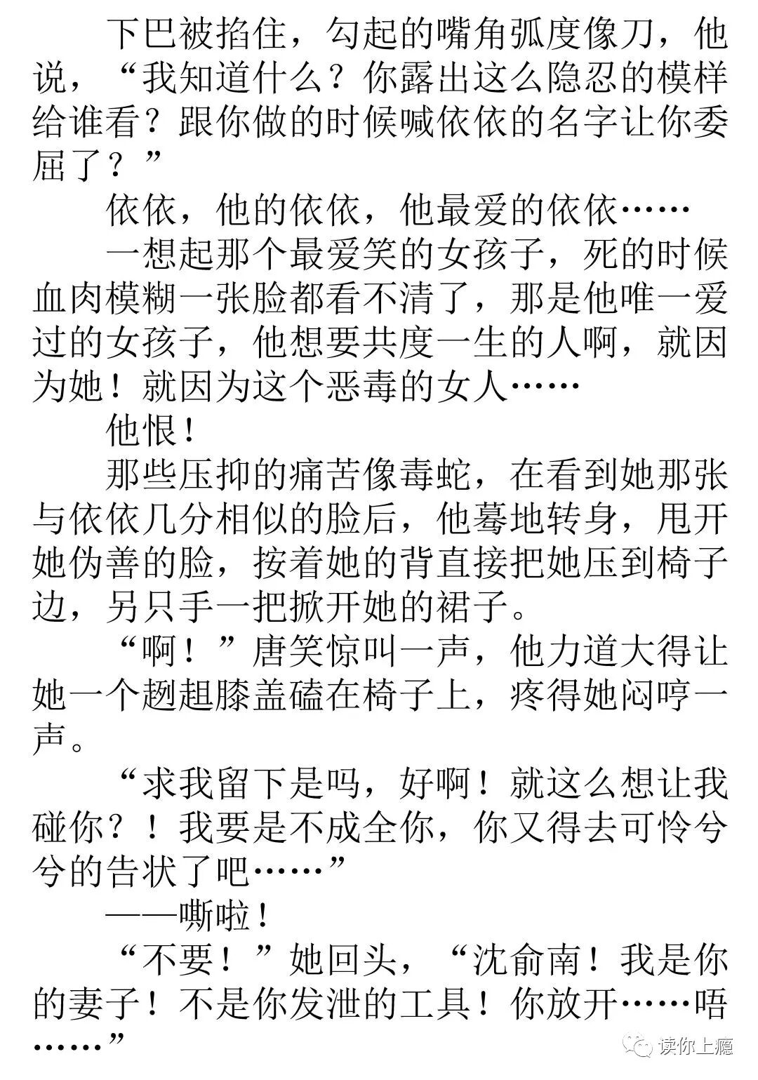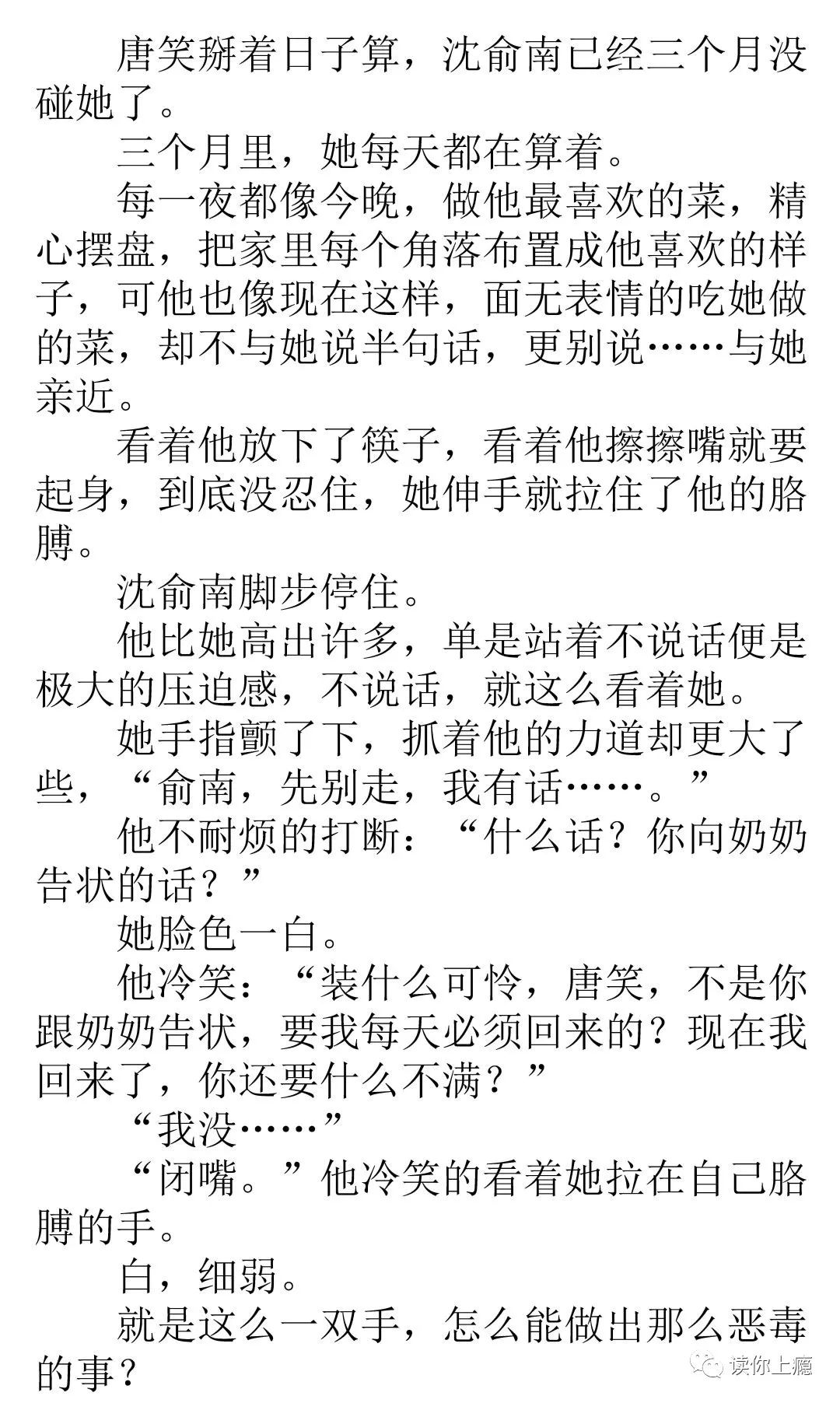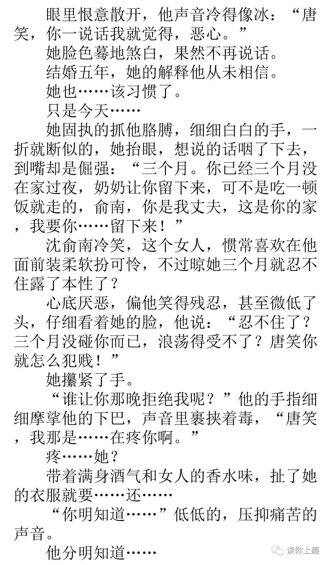 唐笑掰着日子算,沈俞南已经三个月没碰她了. 读你上瘾 内地女星 2018-12-01 22:03:48 788 创作不易,用心坚持,欢迎请BaGua喝几杯爱心咖啡!打赏并支持本文 打赏并删除本文 “俞南,我爱你。”她抱着身上发泄的男人,呜咽。“别扫兴,唐笑。”他残忍的笑,“婊子谈情让人恶心。”……终于,她绝望嘶吼:“沈俞南,我死了,再不会有人像我这般爱你!我诅咒你,诅咒你失去我会后悔!诅咒你永远得不到幸福!”他面无表情:“唐笑,可惜,你的死就是我最大的幸福。”虐恋总裁短篇开始阅读点击“阅读原文” 创作不易,用心坚持,欢迎请BaGua喝几杯爱心咖啡!打赏并支持本文 打赏并删除本文 感谢您的支持鼓励,我会继续努力的!文章地址:用户邮箱:打赏金额:USDT 请输入数字点击”去打赏“,即可进行打赏支持本文章哦 唐笑 About the Author 读你上瘾 功能介绍:读你上瘾 Related Posts 唐笑掰着日子算,沈俞南已经三个月没碰她了. 2018-12-01 22:03:48 发表评论