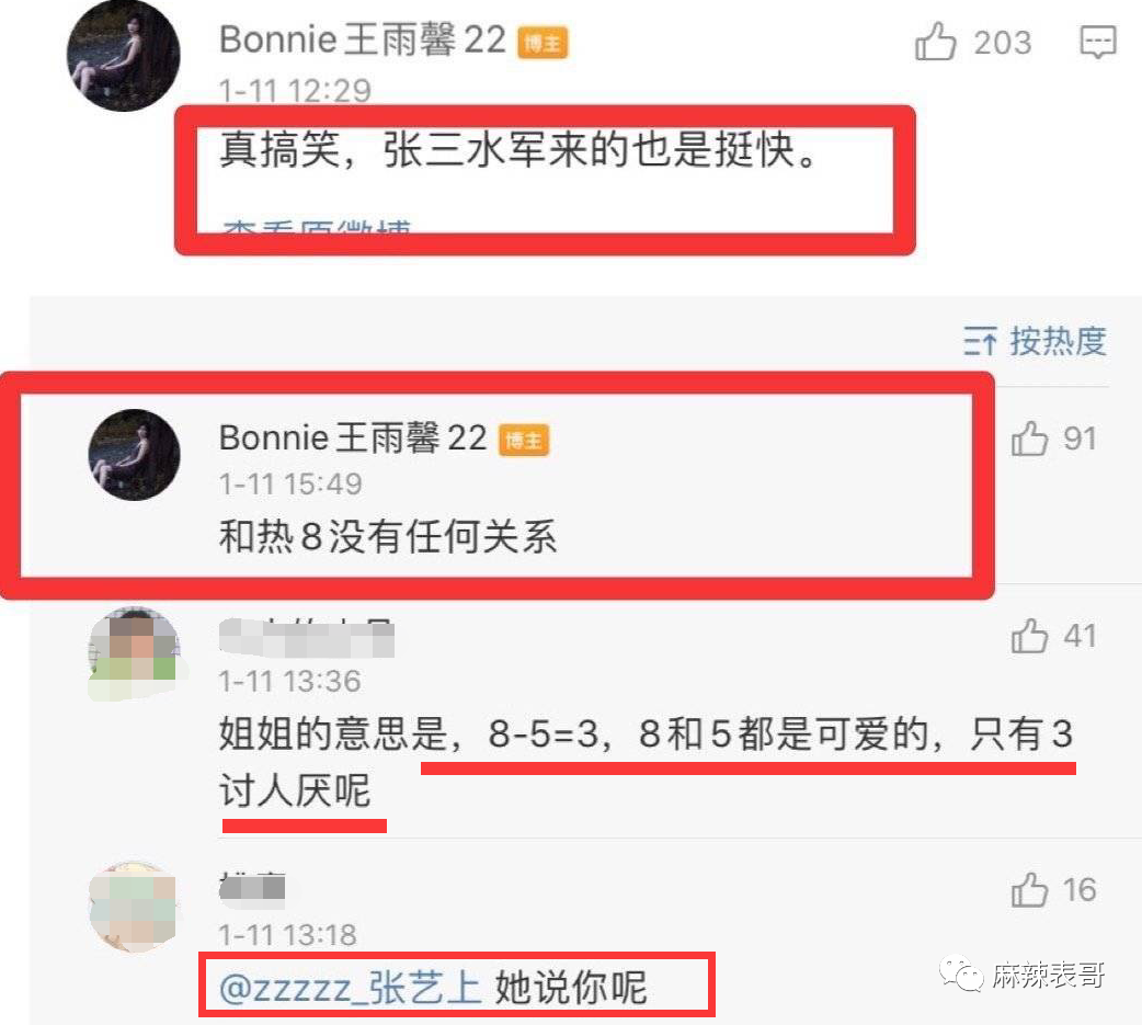 但王雨馨说和热8没有关系,并直接骂张艺上派了水军。