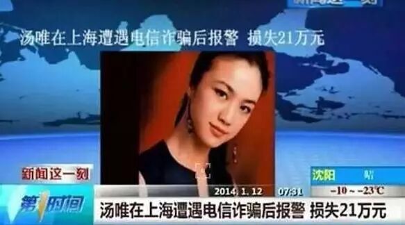 14年汤唯在上海拍戏的时候遭到电话诈骗,接受电话指示到银行办理了一系列业务,事后发现遭遇电信诈骗,当时网爆她损失20多万,新闻媒体还报道了这件事。