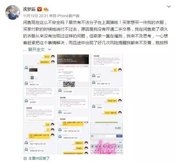 2018年11月19日,沈梦辰在某交易平台被骗3000元,微博发文怒斥骗子,并提醒大家不要上当受骗。