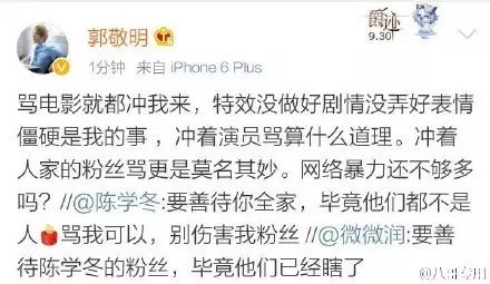 随后郭敬明还发微博力挺,骂电影可以,冲着人家演员算什么道理。冲着人家的粉丝更是莫名其妙。