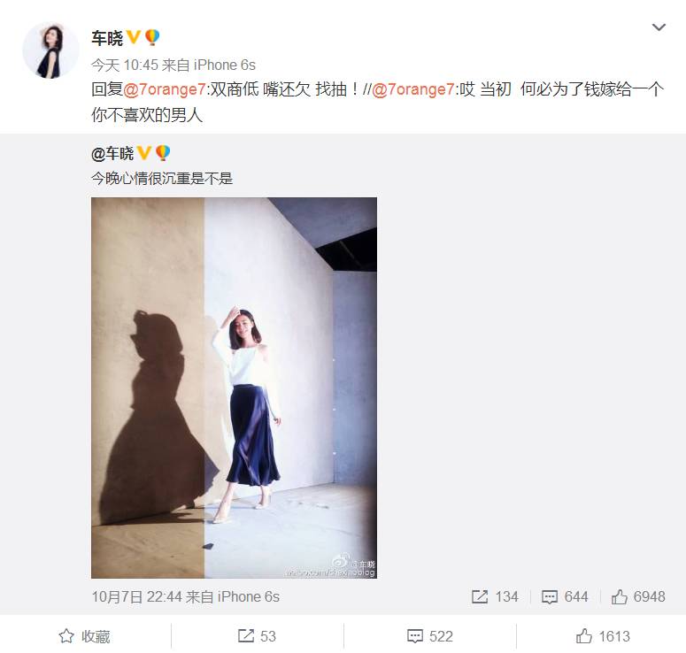 于是车晓果断把网友评论挂了出来,怒斥“双商低,嘴还欠,找抽!”
