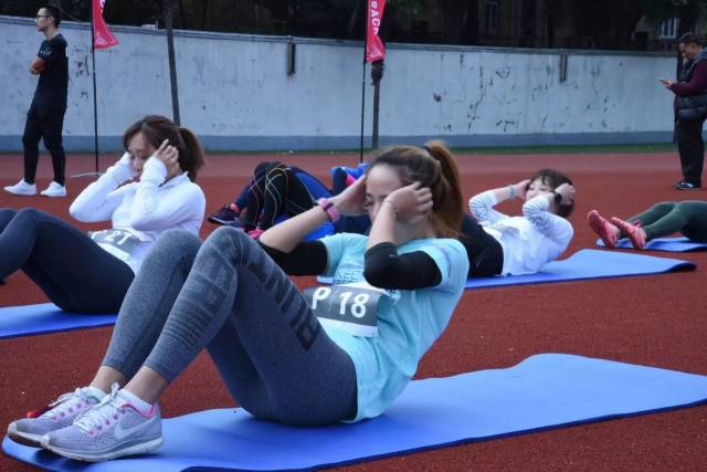 俯卧撑20次、仰卧起50次、高抬腿30秒、立卧撑15次、背肌50次。