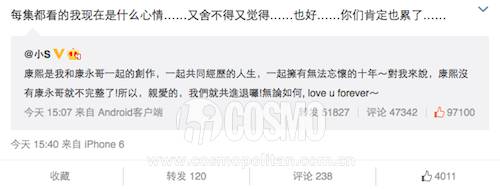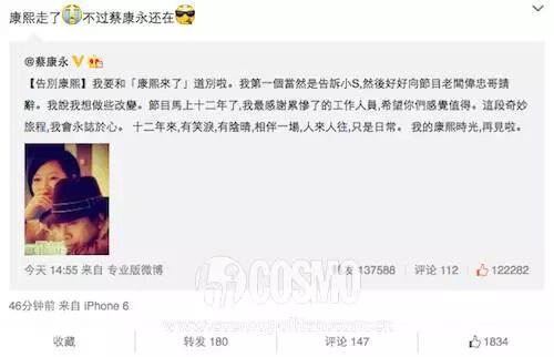 如果说康熙成就了小S和蔡康永在事业上的成功,那么他们两人因为节目结成的缘分更让人看到十分珍贵。