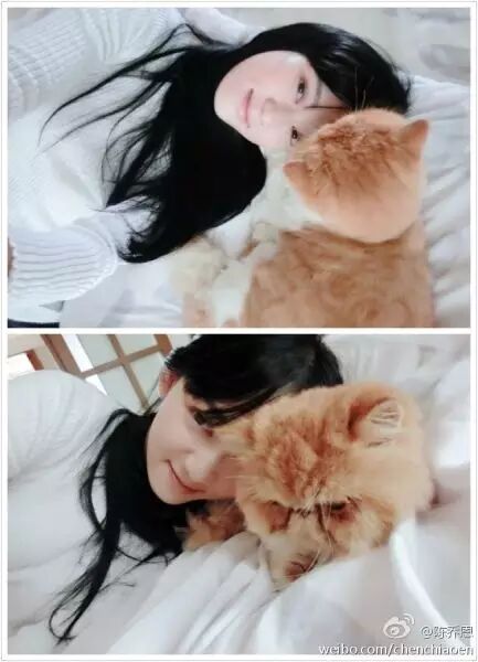 动物都很好动,很难控制,所以最好选择舒服的位置,像陈乔恩这张卧在床上,猫咪趴在前面的角度,相对来说是比较好操作的,因为如果采取单手抱着猫咪,另一手举着手机的话,猫咪很可能会挣扎,或者低着头眼神不知飘向哪儿。但是当它稳稳地坐着的时候,就为你的姿势留出发挥的空间,侧卧、半躺、平趴、跪坐任君选择,唯一需要克服的小障碍,是你可能要训练一下宠物看镜头,不然每张都是它不屑的眼神和圆鼓鼓的屁股,那样真的有点丢脸耶。